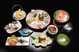 泳ぎ真鯖、イッサキ、鯛、カンパチなどのその季節ごとの旬の魚から伊勢海老、檜扇貝、車海老、アワビなど常時十数種程度の魚介類がおり、いつでも新鮮な海鮮料理をご堪能いただけます。