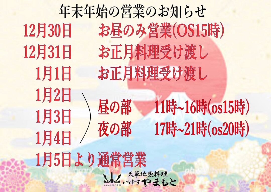 令和7年12月店休日のおしらせと年末年始営業のご案内 天草地魚料理いけすやまもと 2025.12.252025.12.02 あまくさ村年末年始営業時間のご案内 天草地魚料理いけすやまもと年末年始営業のお知らせ