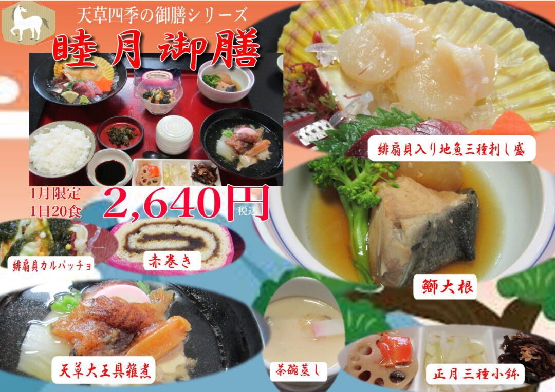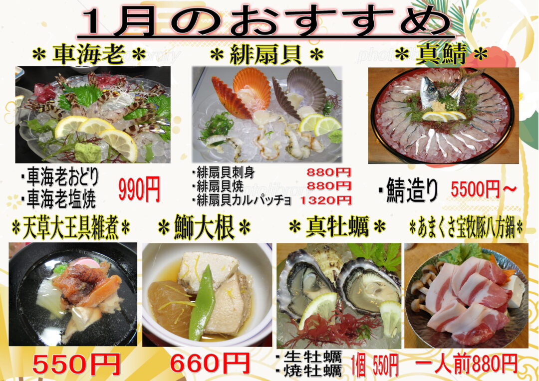 令和8年1月のおすすめ 天草地魚料理いけすやまもと 2026.01.02 睦月御膳・一月のおすすめ~天草地魚料理いけすやまもと 睦月御膳 一月のおすすめ 冬のあったかフェア~肉専門のレストランビーフヤヒロ 冬メニュー~「居酒屋語らいの里あまくさ村」