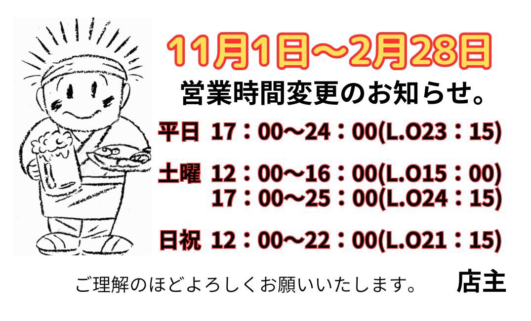 月~金曜日 17:00~24:00(ラストオーダー23:15 ドリンクオーダーストップ23:30)