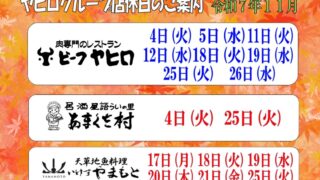 天草本渡のお食事処ヤヒログループの忘新年会コースのチラシの内容です。「肉専門のレストランビーフヤヒロ」「居酒屋語らいの里あまくさ村」「天草地魚料理いけすやまもと」の三店舗を掲載しています。